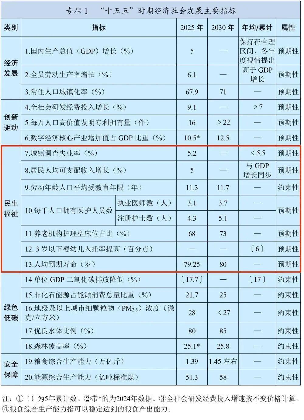 ——人民生活品质不断提高。就业保持总体稳定,城镇调查失业率低于5.5%,高质量充分就业取得新进展。居民收入增长和经济增长同步、劳动报酬提高和劳动生产率提高同步,分配结构得到优化,中等收入群体持续扩大。劳动年龄人口平均受教育年限提高到11.7年,人民群众养老托育服务需求得到更好满足,人均预期寿命提高到80岁,社会保障制度更加优化更可持续,基本公共服务均等化水平明显提升。