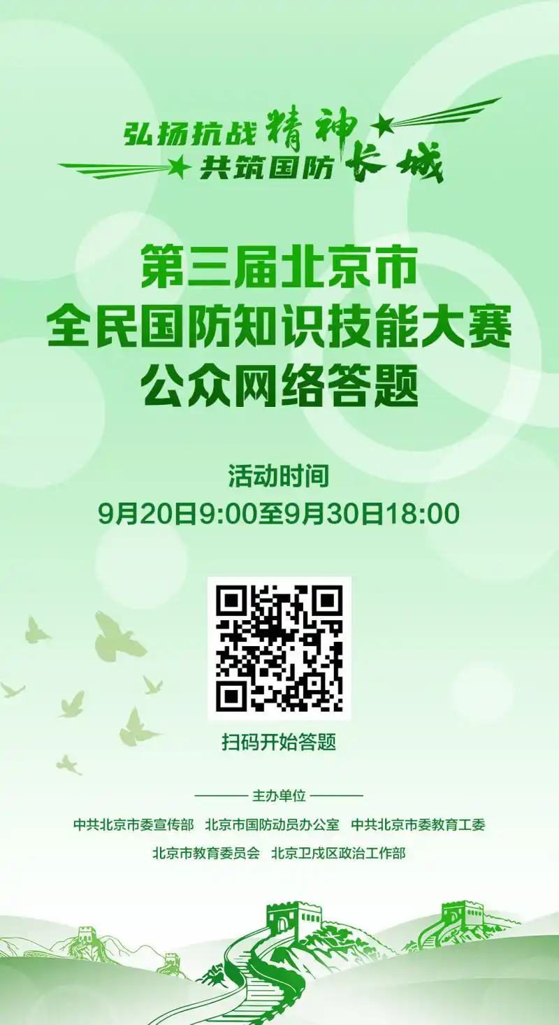 为深入学习贯彻习近平总书记关于加强全民国防教育的重要论述,隆重纪念中国人民抗日战争暨世界反法西斯战争胜利80周年,严格落实中共中央宣传部、中共北京市教委等《关于举办“第三届北京市全民国防知识技能大赛”的通知》要求,进一步深化全民国防教育,增强全社会国防观念,提升公民国防素养,校工会组织开展以“弘扬抗战精神 共筑国防长城”为主题的“第三届北京市全民国防知识技能大赛公众网络答题”活动。现将有关事项通知如下: