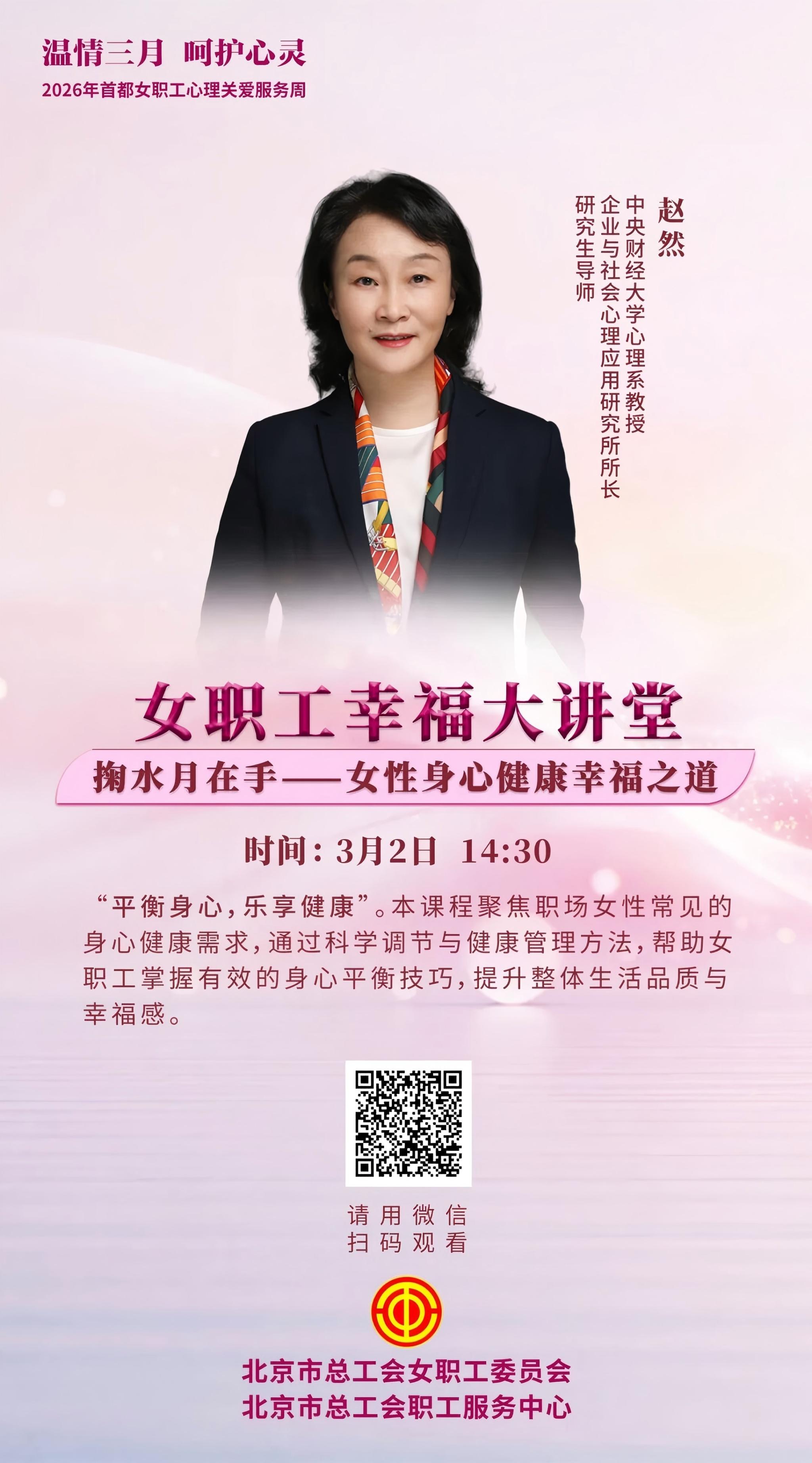 请各分工会及时将讲座通知传达至本单位女教职工,积极动员大家按时参与学习;讲座内容围绕女性身心健康、压力调节、幸福能力提升等方面展开,针对性强,建议广大女教职工合理安排工作时间,积极参与学习;后续3月3日—3月6日还将陆续推出4场不同主题的心理健康讲座,具体安排将另行通知,欢迎持续关注。