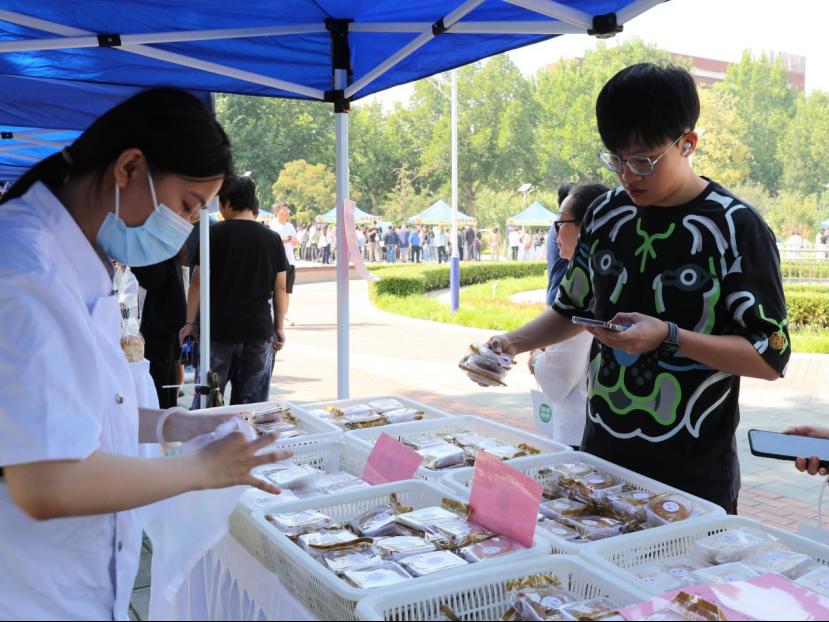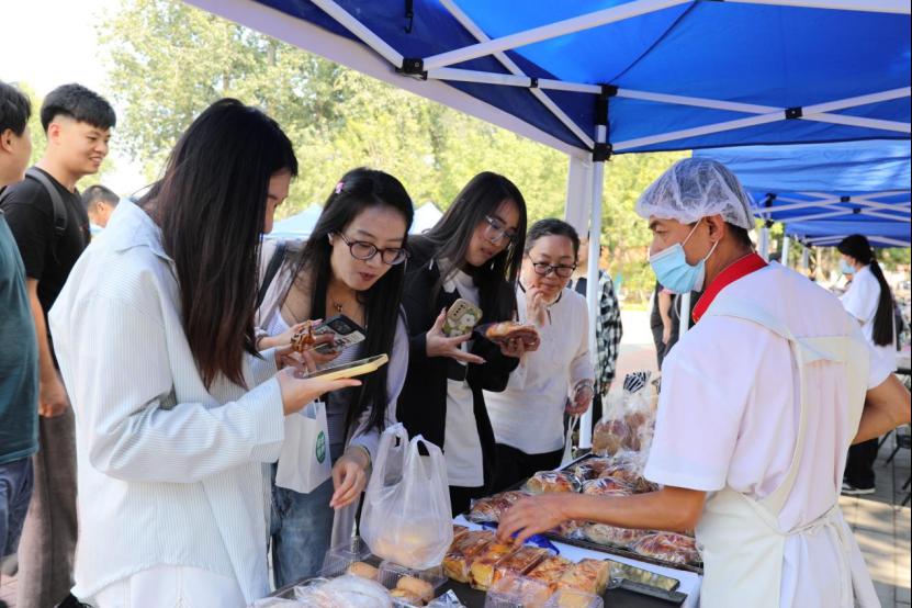 学校饮食中心自制的清真酱牛肉、卤鸡爪、桃酥、糖火烧、奶皮子酸奶等熟食和糕点饮品以及校友、合作企业带来的多种美食也深受师生喜爱。