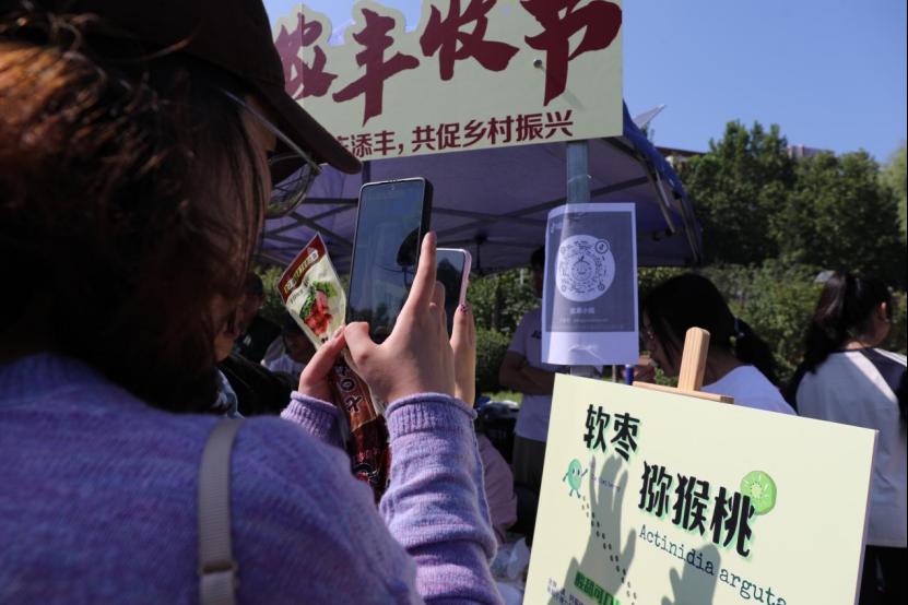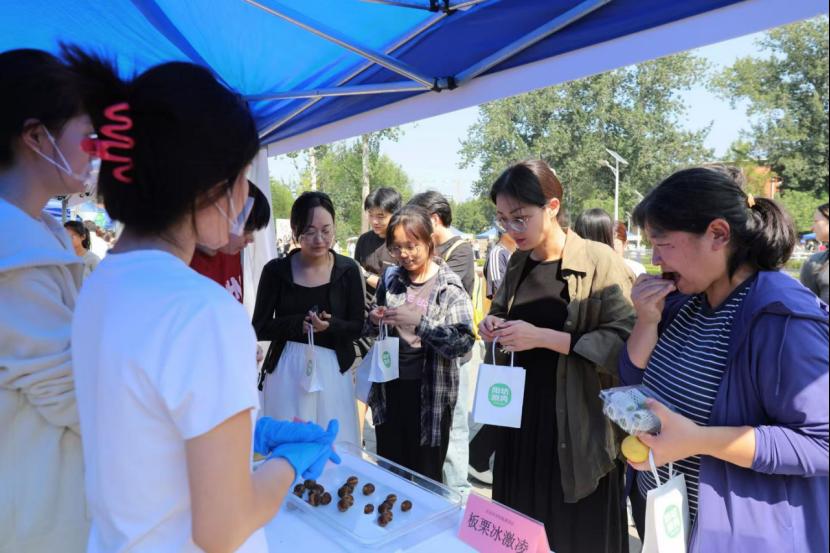 作为活动的“核心展区”,食品展示区的百余种展品香气四溢,从科研成果到可口美食,每一份展品都展现着北农与“三农”的深厚联结。我校教授工作站、科技小院、博士农场等社会服务基地的成果展台前更是排起长队——果肉饱满的软枣猕猴桃、清甜多汁的延庆甜瓜、口感独特的“北农冰栗”、果香浓郁的松棚挽翠桃,以及北农自产的脆甜苹果、饱满花生、软糯红薯……琳琅满目的丰收果实吸引师生们纷纷驻足品尝。