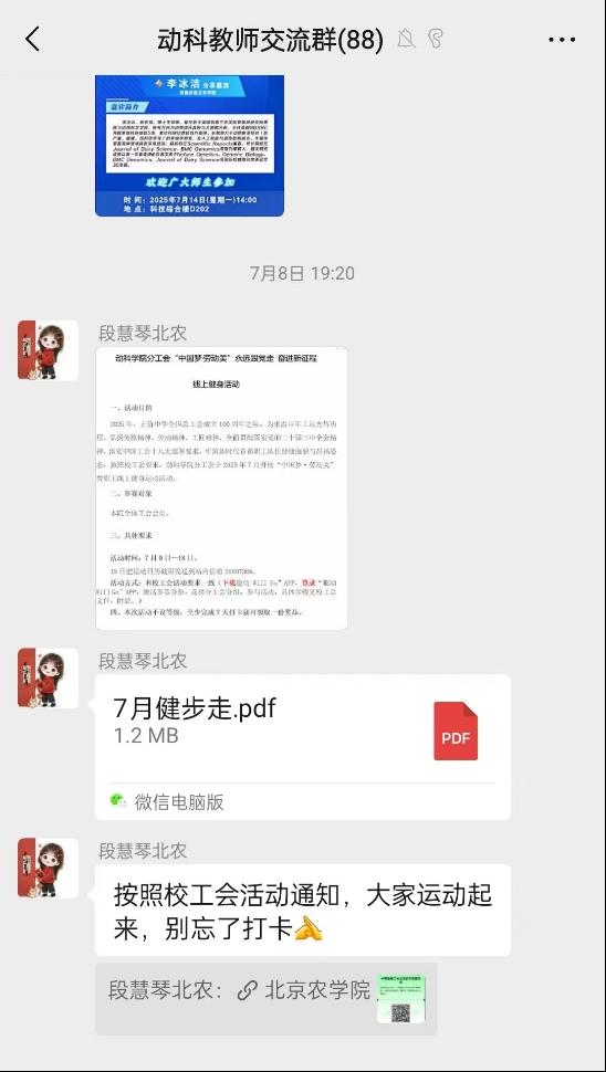 动科学院讯 为迎接中华全国总工会百年华诞,践行“中国梦·劳动美”主题,动物科技学院工会小组在校工会统一部署下,组织全体教师暑期投身“百年工运百日燃”线上健身打卡。健步走、AI 跳绳、平板支撑……十余种“菜单式”项目让老师们在实验室、在家、在旅途都能“一键开练”。每日点亮一个工运站点、阅读一段红色故事,运动与党史学习同频共振,成为动科学院假期最热的“风景线”。