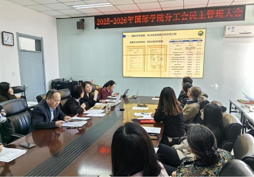 2026年1月21日中午,国际学院在226会议室召开了2025年度民主管理大会。学院全体教职工参加会议,分工会主席杨熙主持会议。